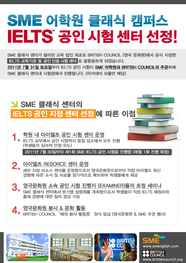 SME 어학원 클래식 센터가  필리핀 교육 법인 최초로  BRITISH COUNCEIL(영국 문화원)에서 공식 지정한 IELTS 교육기관 및 공인 인증 시험센터로 발돋움하게 되었습니다. 2011년 7월 31일 토요일부터 IELTS 공인 시험이 SME 어학원과  BRITISH COUNCEIL의 주관하에 SME 클래식 센터내 시험장에서 아카데미 모듈 시험이 진행됩니다.     필리핀 어학연수는 유학빈에 문의주세요. (Tel: 02-3437-0505)   |