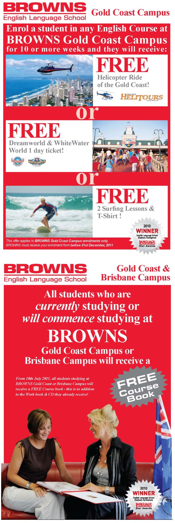 호주어학연수 Browns 스페셜 공지사항   1.  2011년 7월 14일부터 2011년 12월 31일까지 브라운스 골드코스트 캠퍼스에 10주 이상 지원하신 학생분들께는