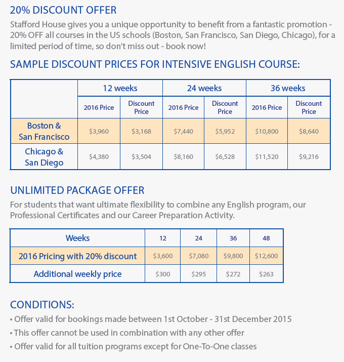 미국의 인기학원인 Intrax가 교육그룹인 Stafford House와 통합되면서, 아래와 같은 프로모션을 진행합니다. 센터는 샌디에고/시카고/샌프란시스코/보스톤의 매력적인 중심부에 위치에 있으며, 무엇보다 친철한 강사진과 다양한 프로그램이 특징입니다. 특히 아래의 프로모션을 올해 까지만 적용되기 때문에, 비즈니스와 인턴쉽프로그램에 관심있으셨던 분들은 좀더 저렴한 학비로 매력적인 프로그램을 공부할 수 있는 절호의 기회가 될 것입니다. 본 프로모션은 12월까지만 제공됩니다.