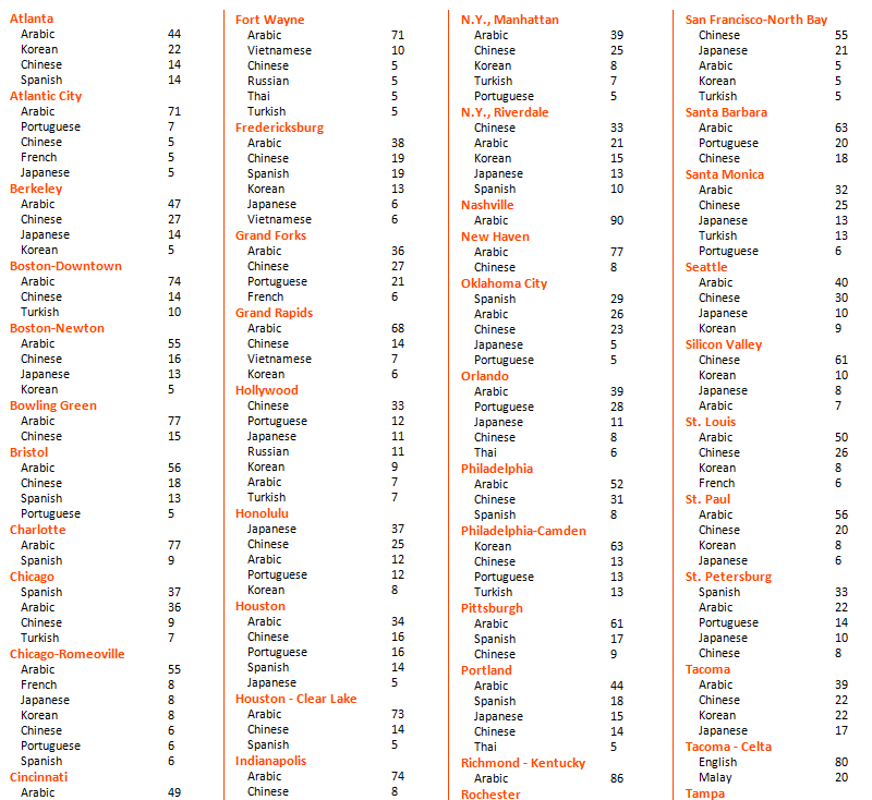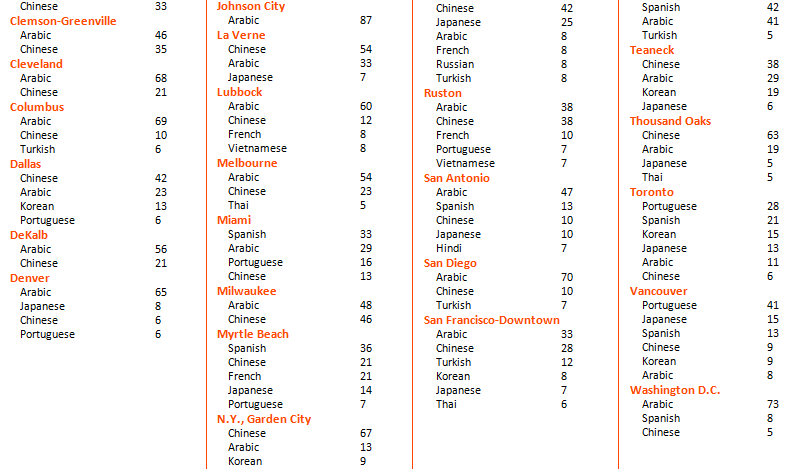 샌프란시스코, 샌디에고, 시카고 등등의 주요 지역에 위치하고 있어요. 센터별 국적비율 안내드려요. ■ ELS 1월 국적비율 =================   ■ ELS 어학원의 장점은 ! ==================== ELS 어학원에서 아카데믹 영어과정을 성공적으로 마치면, 연계된 다양한 대학으로의 진학이 가능해요. 레벨은 총 101 - 112 (12단계)로 되어있으며 대학진학과정(EAP)레벨로 약 109레벨 이수하고 토플점수없이 2년제 대학(CC) 진학 후 4년재로 3학년으로 편입학하거나 112레벨이상을 받으신 후 연계된 대학으로 진학이 가능합니다. ■ ELS 어학원의 레벨은 어떻게 구성되어 있나요? =======================================