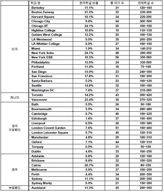혹시 한국인 비율이 적은 지역을 찾고 계신가요?? 아래 한국학생비율 안내를 참고해 주세요.