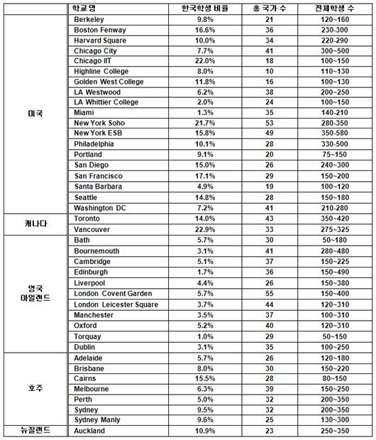 혹시 한국인 비율이 적은 지역을 찾고 계신가요? 아래 한국학생비율 안내를 참고해 주세요.