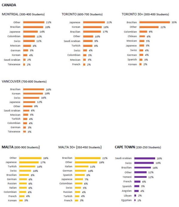 카플란 Kaplan, 엠버씨 Embassy, EC, ELS 가 대표적인데요. EC 어학원의 최신 국적비율 안내 드립니다. 미국, 영국, 캐나다, 몰타에 센터가 있구요, 한국인 비율이 낮은 어학원이에요.^^ 공무원 유학 및 어학연수 가시는 분들도 사전 준비를 위해 안내 받으실 수 있어요.
