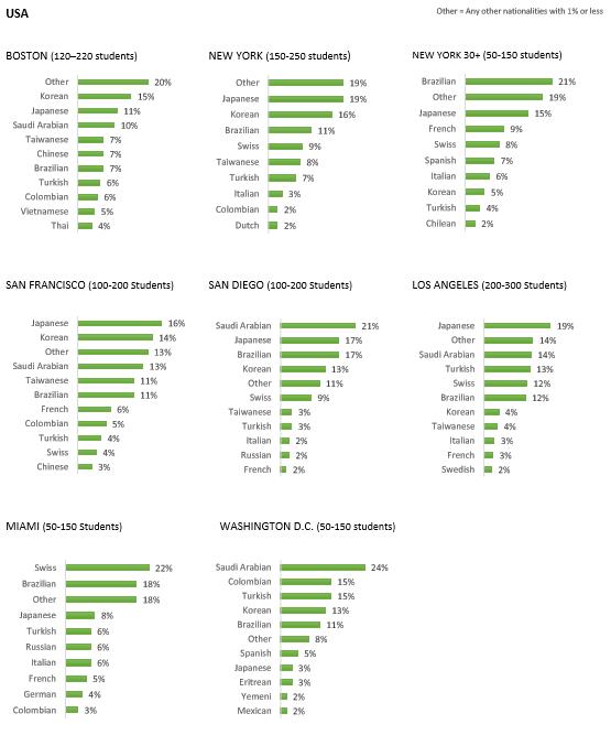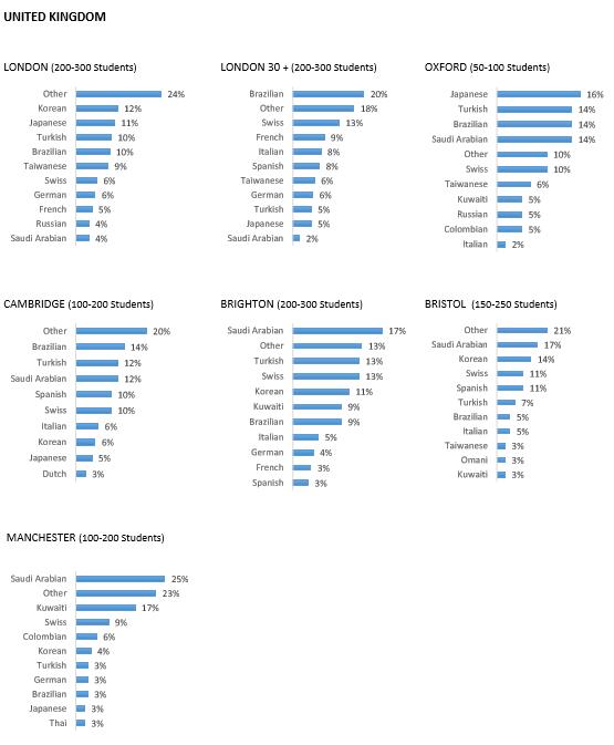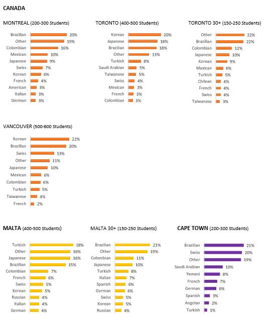 카플란 Kaplan, 엠버씨 Embassy, EC, ELS 가 대표적인데요. EC 어학원의 최신 국적비율 안내 드립니다. 미국, 영국, 캐나다, 몰타에 센터가 있구요, 한국인 비율이 낮은 어학원이에요.^^ 공무원 유학 및 어학연수 가시는 분들도 사전 준비를 위해 안내 받으실 수 있어요.