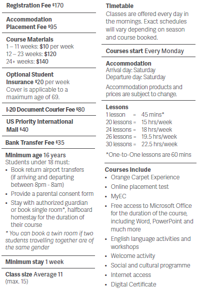 ※ 학교나 어학기관에 따라서, 위의 비용외에 기타비용이 발생할 수 있으며, 숙소 타입 또한 비용변동이 있을 수 있습니다.