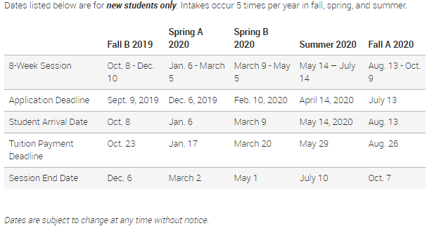 Dates listed below are for new students only. Intakes occur 5 times per year